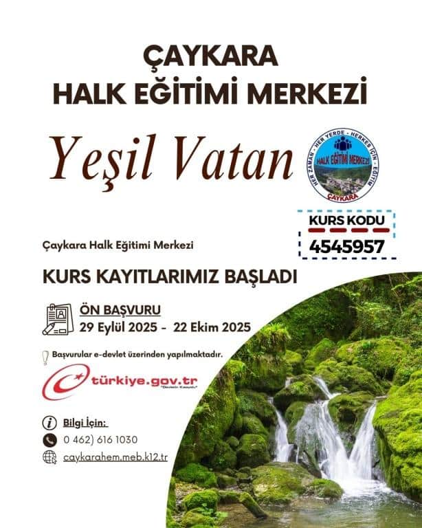 Kurumumuz bünyesinde açılacak olan kurslara kursiyer olacak katılan tüm kursiyerlere yönelik olarak Yeşil Vatan kursu açılmıştır. Kursumuz 22 Ekim 2025 günü kurum binamızdaki çok amaçlı salonda gerçekleştirilecektir.